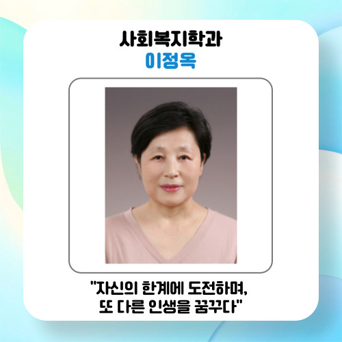 ³ªÀ̰¡ ÇÑ »ì ÇÑ »ì µé¾î°¡¸ç ³ëÀÎ º¹Áö¿Í ¾Æµ¿º¹Áö¿¡ °üÇÑ °ü½ÉÀÌ »ý°å´Ù. ƯÈ÷ 8³â µ¿¾È ¾î¸°ÀÌ ÇÁ·Î±×·¥À» ÁøÇàÇϰí, 3³â µ¿¾È ¸ÅÁÖ Àå¾ÖÀκ¹Áö½Ã¼³¿¡ ºÀ»ç¸¦ ´Ù´Ï¸é¼ Á÷¾÷À¸·Î¼ÀÇ »çȸº¹Áö»ç¿¡ ´ëÇØ »ý°¢ÇÏ°Ô µÇ¾ú´Ù. ÇпøÀ̳ª »çÀ̹ö ´ëÇб³¿¡¼ »çȸº¹Áö»ç ÀÚ°ÝÁõÀ» ÃëµæÇÒ ¼ö ÀÖ¾úÁö¸¸, ´ëÇп¡ ÁøÇÐÇÏ¿© ü°èÀûÀÎ °øºÎ¸¦ ÇÏ°í ½Í¾î 64¼¼¿¡ ¸íÁö´ëÇб³ ¹Ì·¡À¶ÇÕ´ëÇп¡ ÀÔÇÐÇÏ°Ô µÇ¾ú´Ù. ¿À·£¸¸¿¡ ÇÏ´Â °øºÎ¶ó, µû¶ó°¡´Â °ÍÀÌ Àý´ë ½±Áö´Â ¾Ê¾Ò´Ù. °øºÎÇÒ ¶§ ½£À» º¸Áö ¸øÇϰí, ³ª¹«¸¸ º¸´Â ¼ºÇâÀÌ ÀÖ¾î ¾î¶² °ÍÀÌ Áß¿äÇÑ °ÍÀÎÁö ÆÄ¾ÇÇϱ⵵ ¾î·Á¿ü´Ù. ±×·¯´ø Áß ¸íÁö´ëÇб³ ¹Ì·¡À¶ÇÕ´ëÇп¡ ¸àÅ丵 ÇÁ·Î±×·¥ÀÌ ÀÖ´Ù´Â °ÍÀ» ¾Ë°Ô µÇ¾ú´Ù.